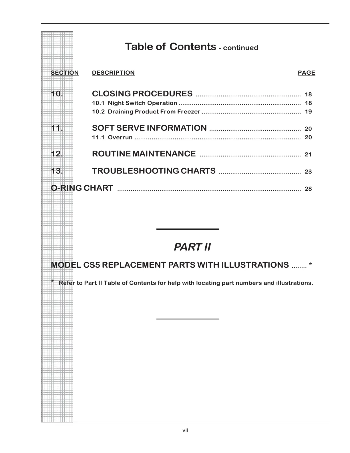 Refer to Part II Table of Contents for help with locating part numbers and illustrations.