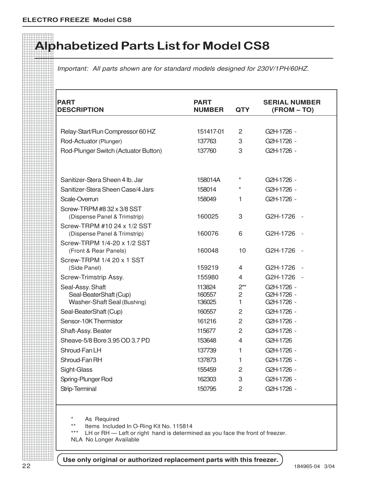 Important: All parts shown are for standard models designed for 230V/1PH/60HZ.
