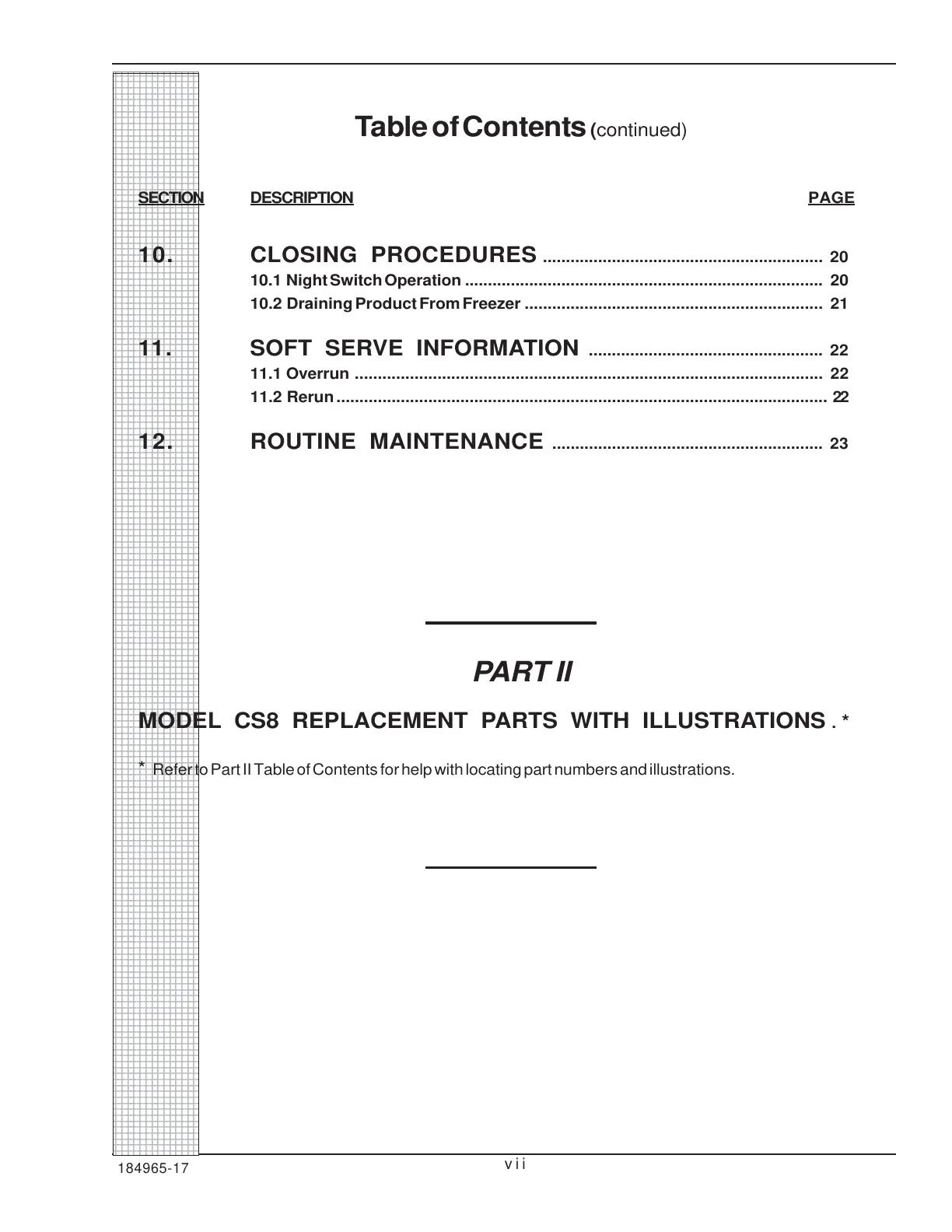Refer to Part II Table of Contents for help with locating part numbers and illustrations.