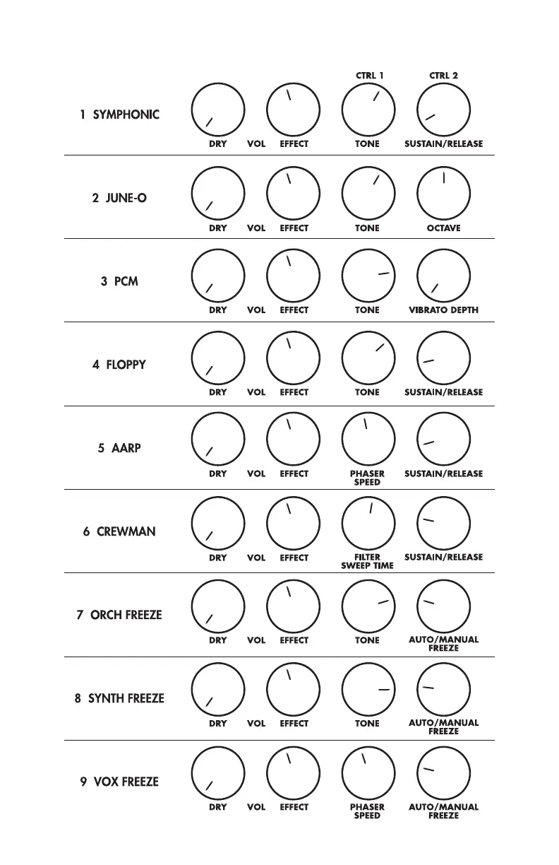 Electro-Harmonix S9 string ensemble - Suggested Factory Settings; Preset Knob Settings Overview