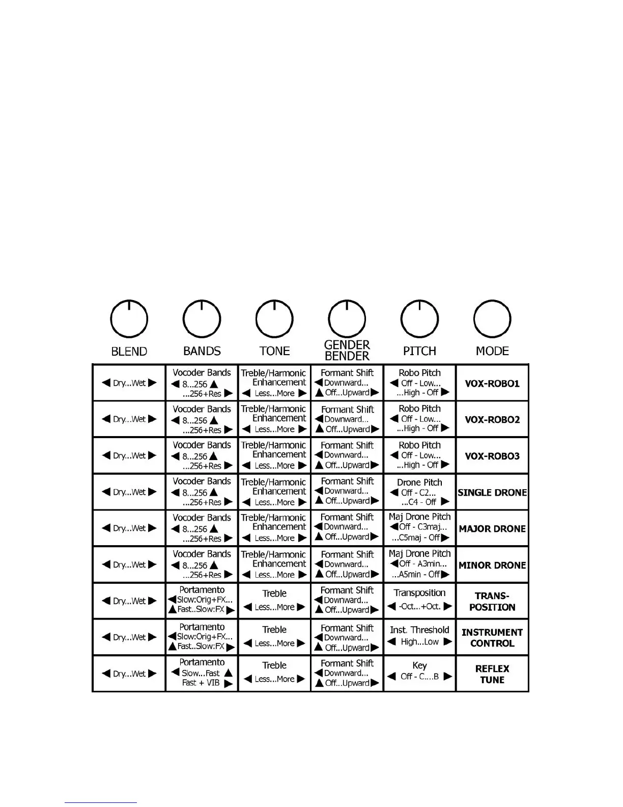 Below is a table displaying the function of each knob as it relates to a selected mode. Arrows