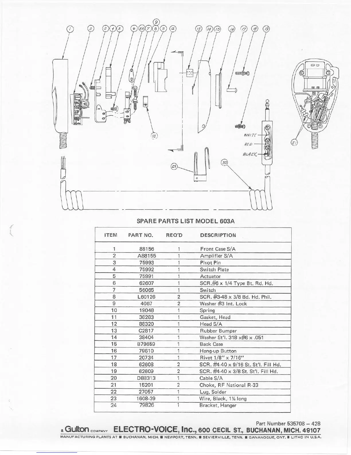 Electro-Voice 603 A - Spare Parts List; Parts Identification; Master Part Number
