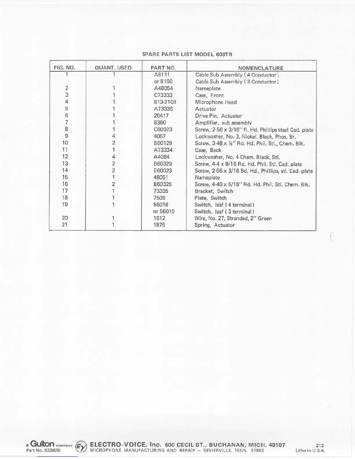 Electro-Voice 603TR - Spare Parts List; Part Identification