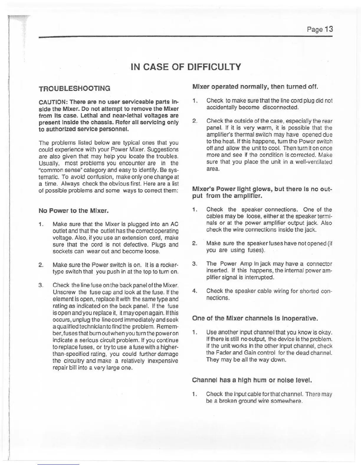 Electro-Voice 61PM - Troubleshooting; No Power to the Mixer; Mixer Operated Normally, then Turned off; One of the Mixer Channels Is Inoperative