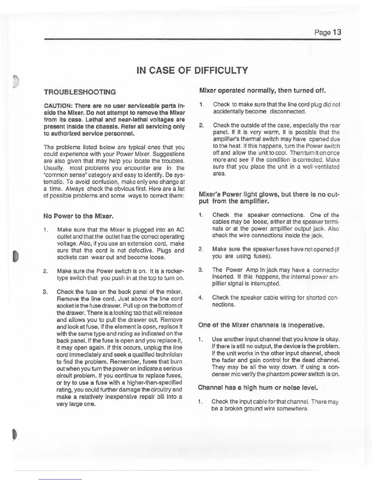 Electro-Voice 61PMX - Troubleshooting Guide; Internal Component Safety Warning; Troubleshooting: No Mixer Power; Troubleshooting: Unexpected Shutdown