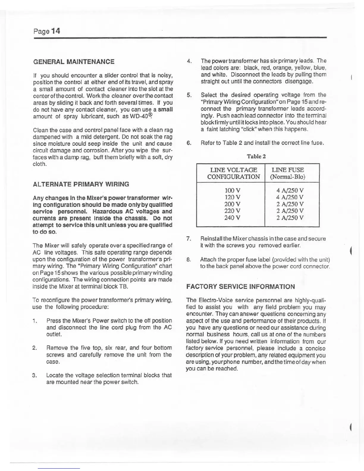Electro-Voice 61PMX - General Maintenance; Slider Control Cleaning; Unit Exterior Cleaning; Alternate Primary Wiring Procedure