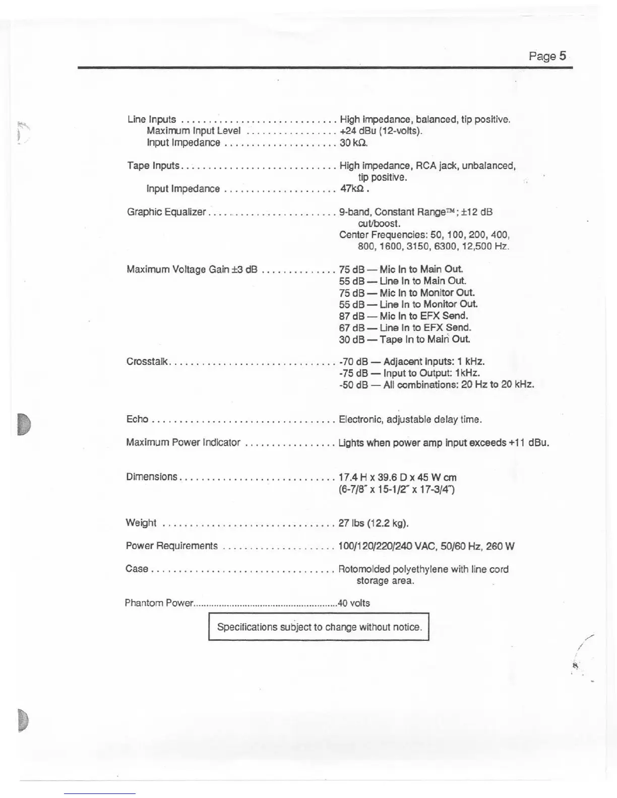 Electro-Voice 61PMX - Line Input Specifications; Tape Input Specifications; Graphic Equalizer Details; Maximum Voltage Gain