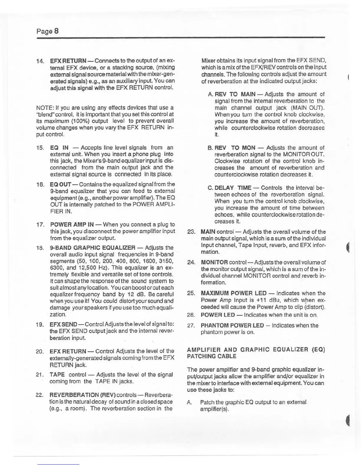 Electro-Voice 61PMX - EFX Return Jack Operation; EQ Input;Output and Power Amp Input; 9-Band Graphic Equalizer Operation; Reverberation (REV) Controls