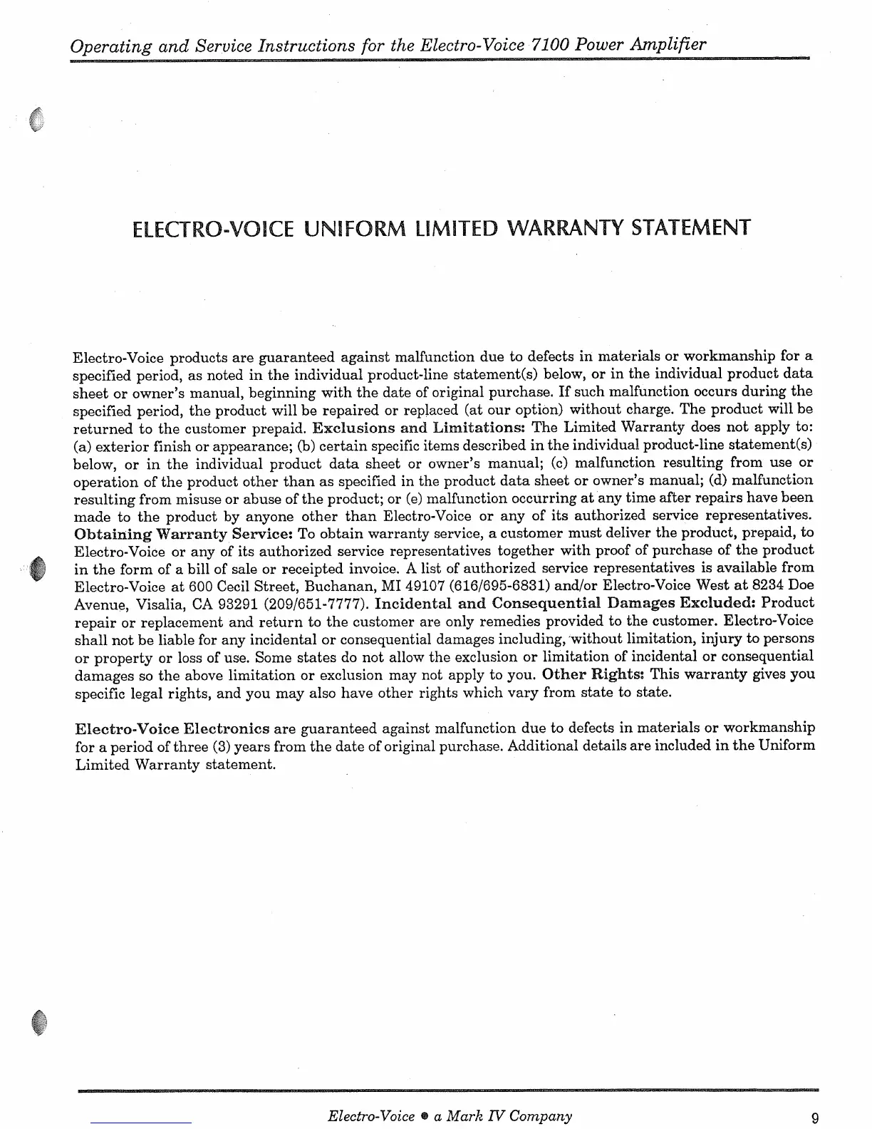 Electro-Voice 7100 - Electro-Voice Uniform Limited Warranty Statement