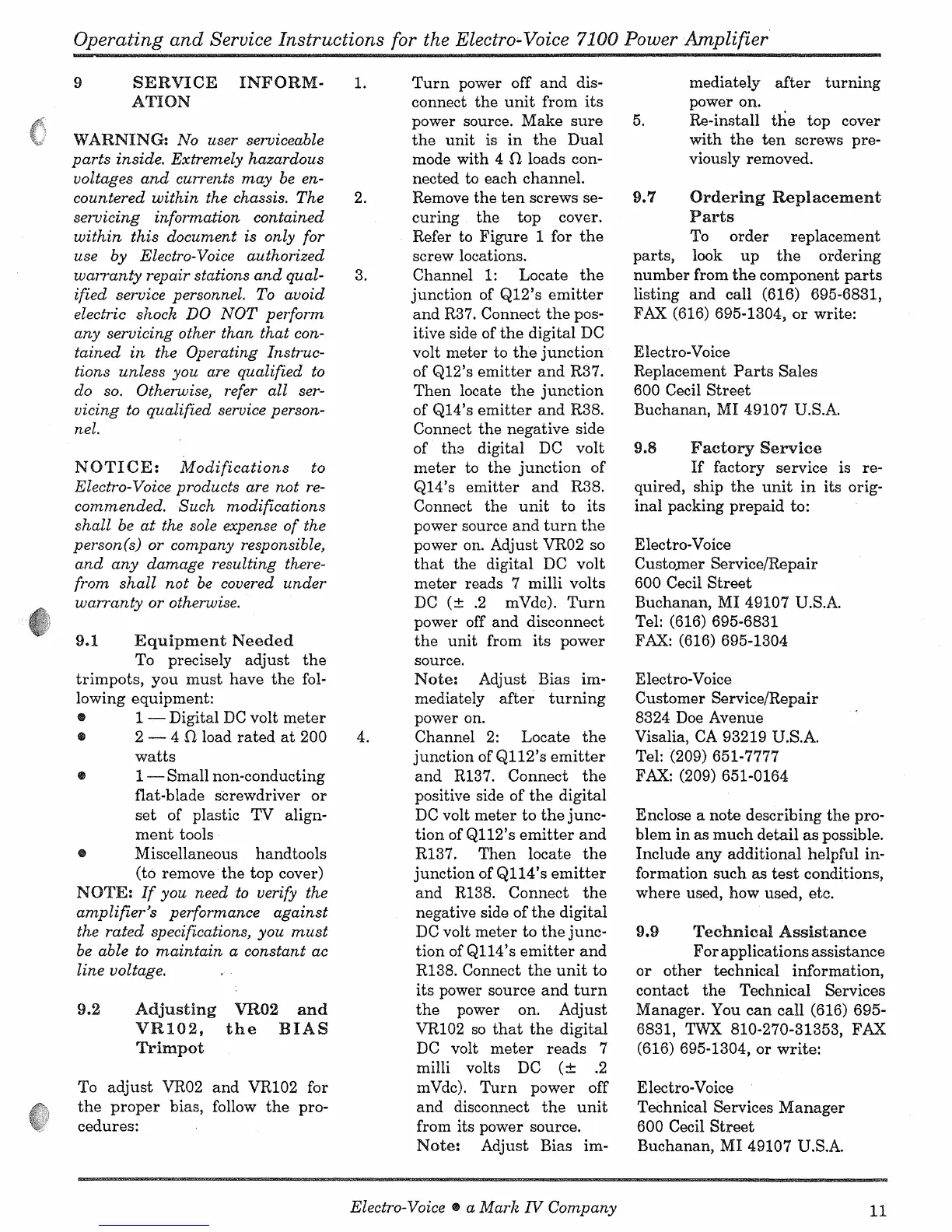 Electro-Voice 7100 - Service Information; Equipment Needed; Adjusting VR02 and VR102, the BIAS Trimpots; Ordering Replacement Parts