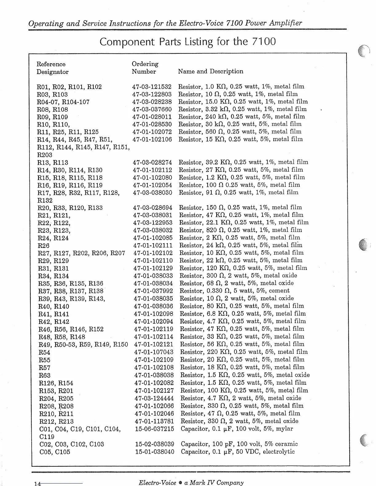 Electro-Voice 7100 - Component Parts Listing for the 7100