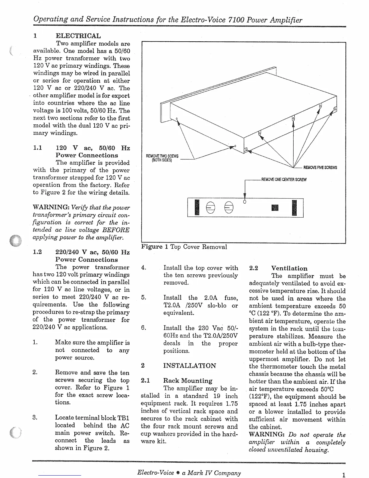 Electro-Voice 7100 - Electrical; 120 Vac, 50;60 Hz Power Connections; 220;240 V ac, 50;60 Hz Power Connections; Installation