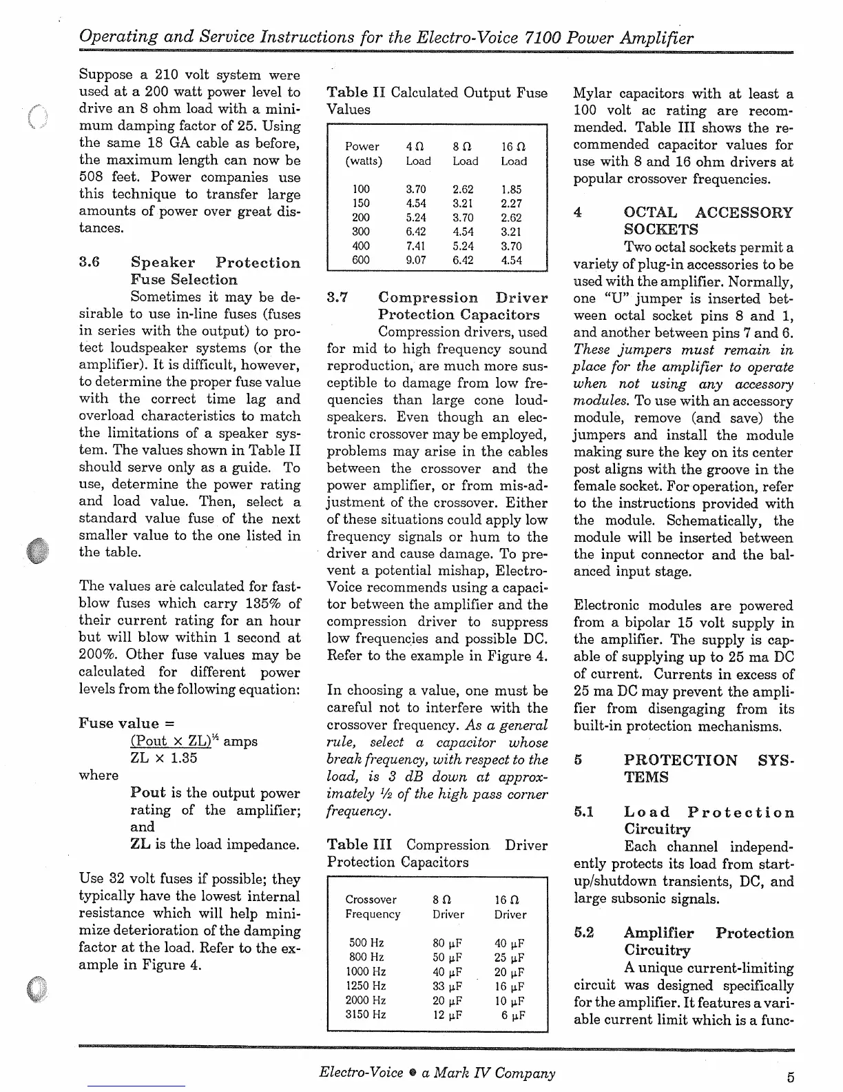 Electro-Voice 7100 - Speaker Protection Fuse Selection; Compression Driver Protection Capacitors; Octal Accessory Sockets