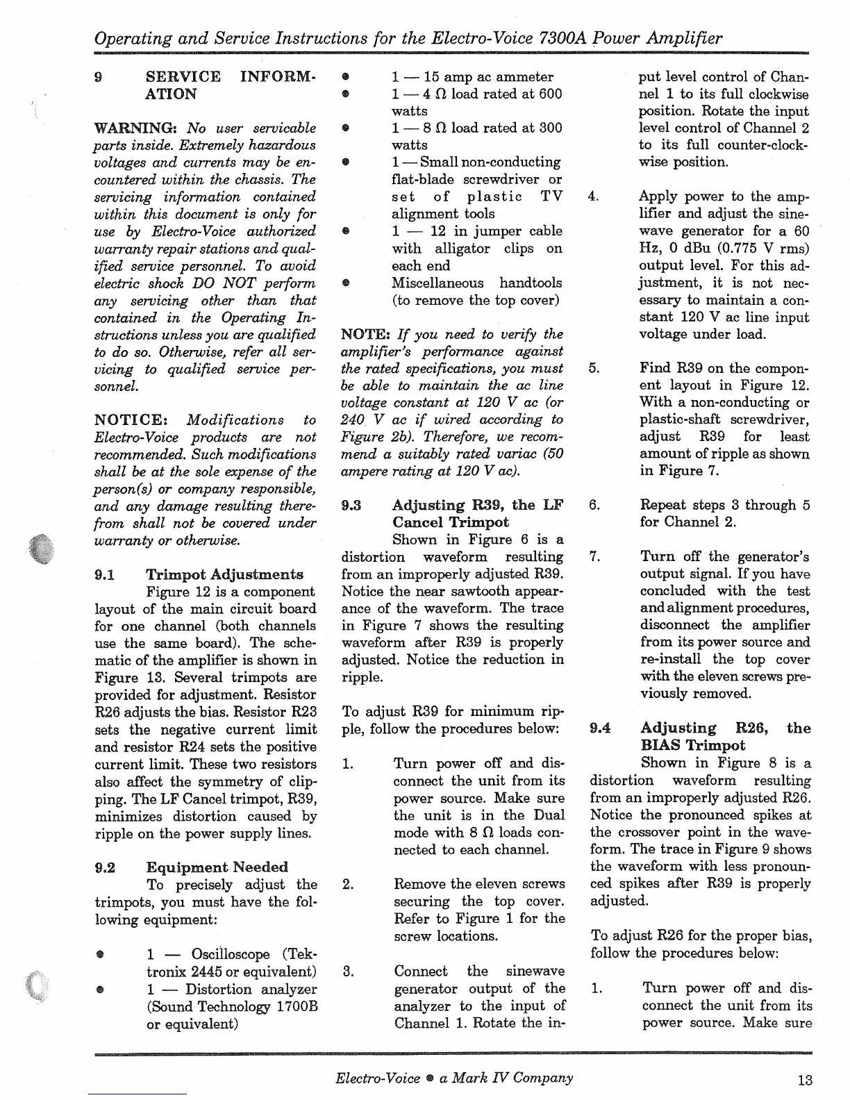 Electro-Voice 7300A - Adjusting R26, the BIAS Trimpot; Adjusting R23 and R24, Current Limit Trimpots