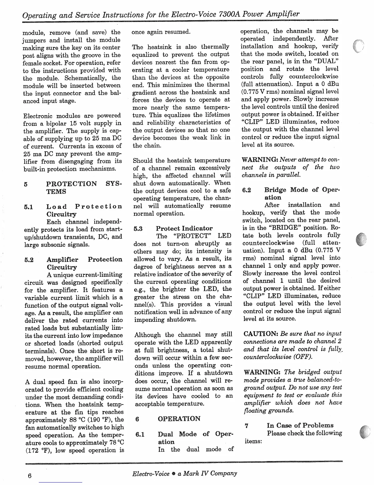 Electro-Voice 7300A - PROTECTION SYSTEMS; Load Protection Circuitry; Amplifier Protection Circuitry
