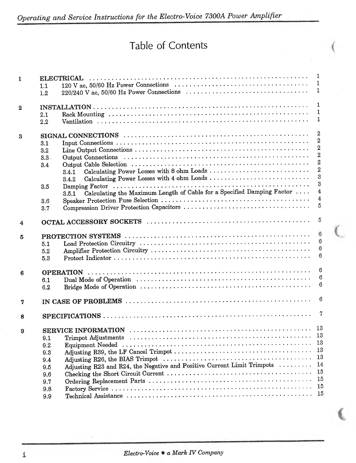 Electro-Voice 7300A - Table of Contents