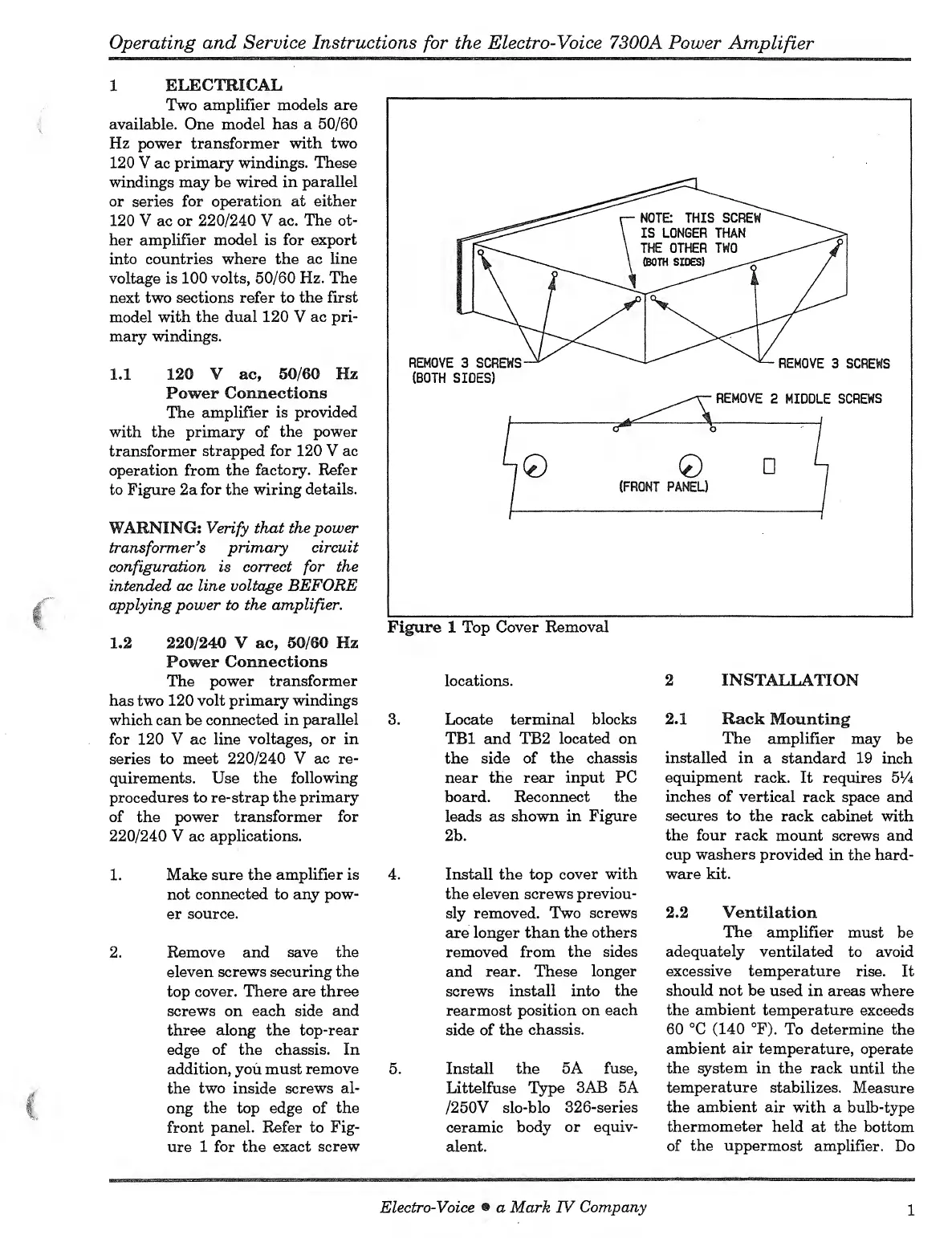 Electro-Voice 7300A - ELECTRICAL; 120 Vac, 50;60 Hz Power Connections; 220;240 V ac, 50;60 Hz Power Connections