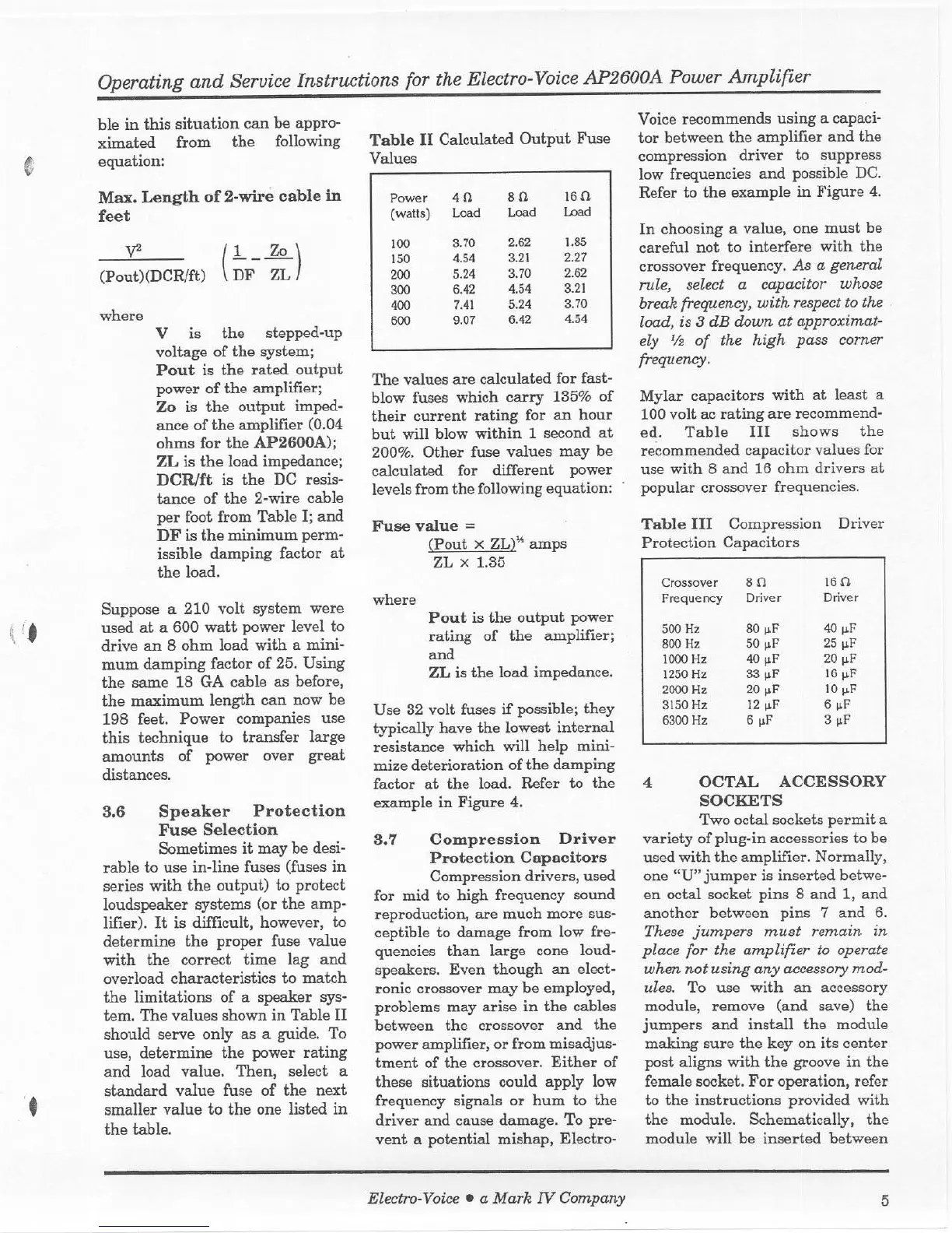 Electro-Voice AP2600A - Speaker Protection and Accessories; Speaker Protection Fuse Selection; Compression Driver Protection; Octal Accessory Sockets