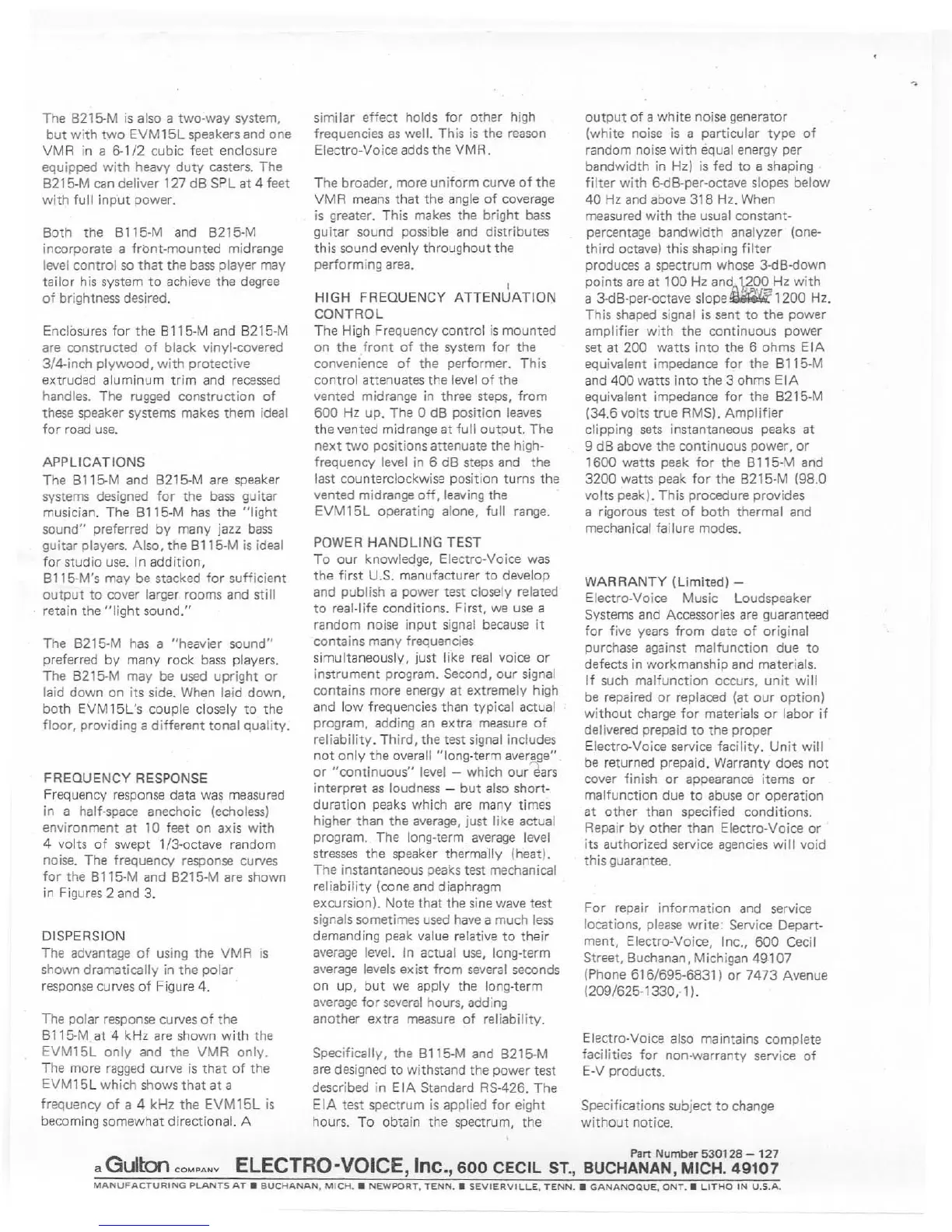 Electro-Voice B115-M - Speaker Applications and Features; Bass Guitar Sound; Vented Midrange (VMR); High Frequency Attenuation Control