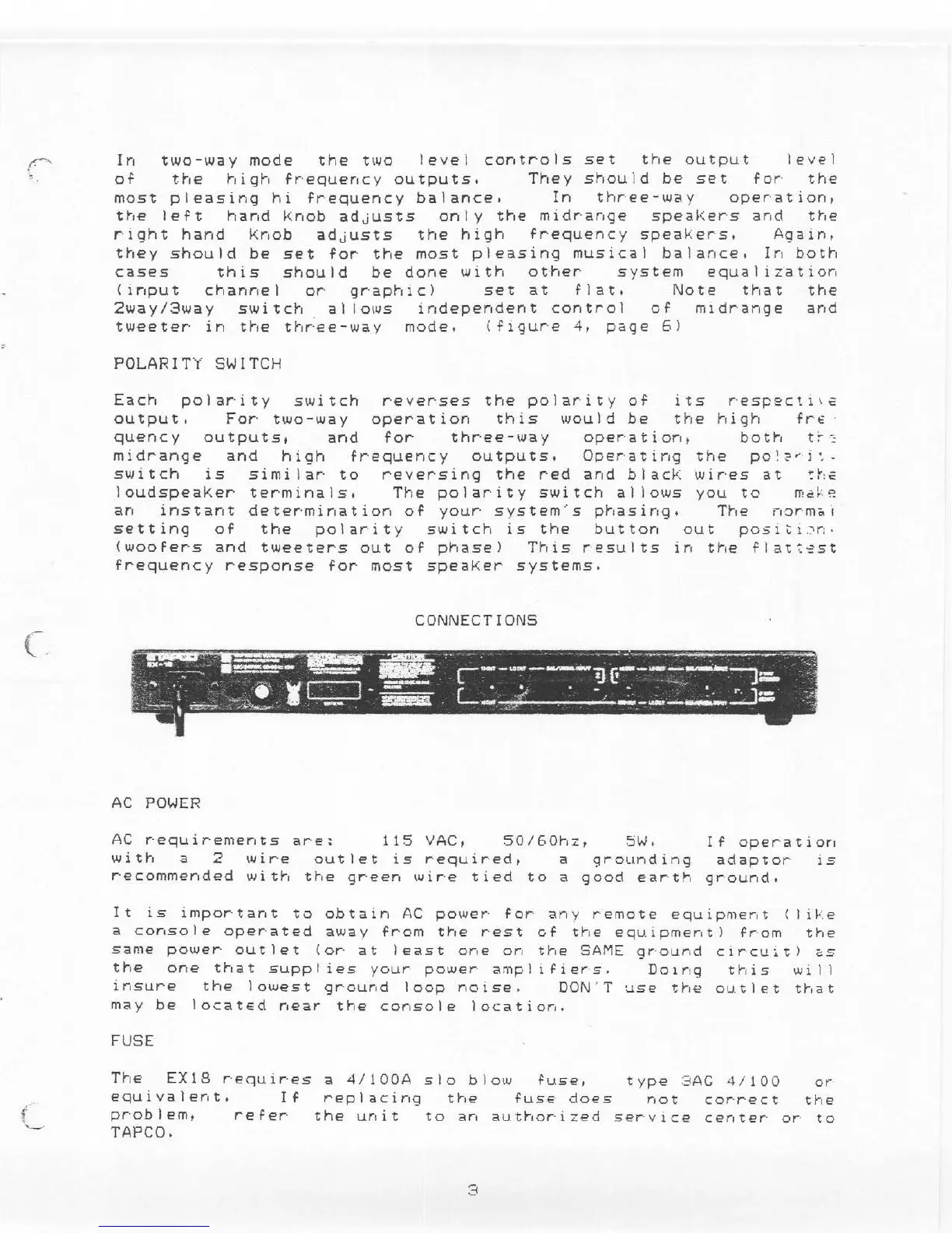Electro-Voice Electronic Crossover EX-18 - Level Controls; Polarity Switch; Connections; AC Power;Fuse