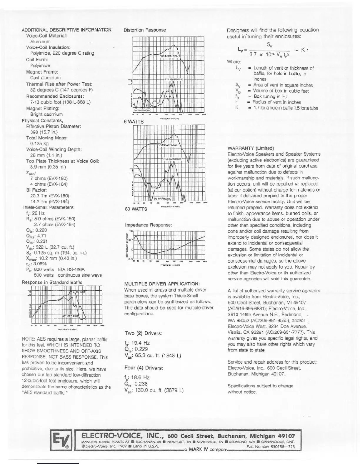 Electro-Voice EVX-180 - Additional Descriptive Information; Distortion Response; Impedance Response; Multiple Driver Application