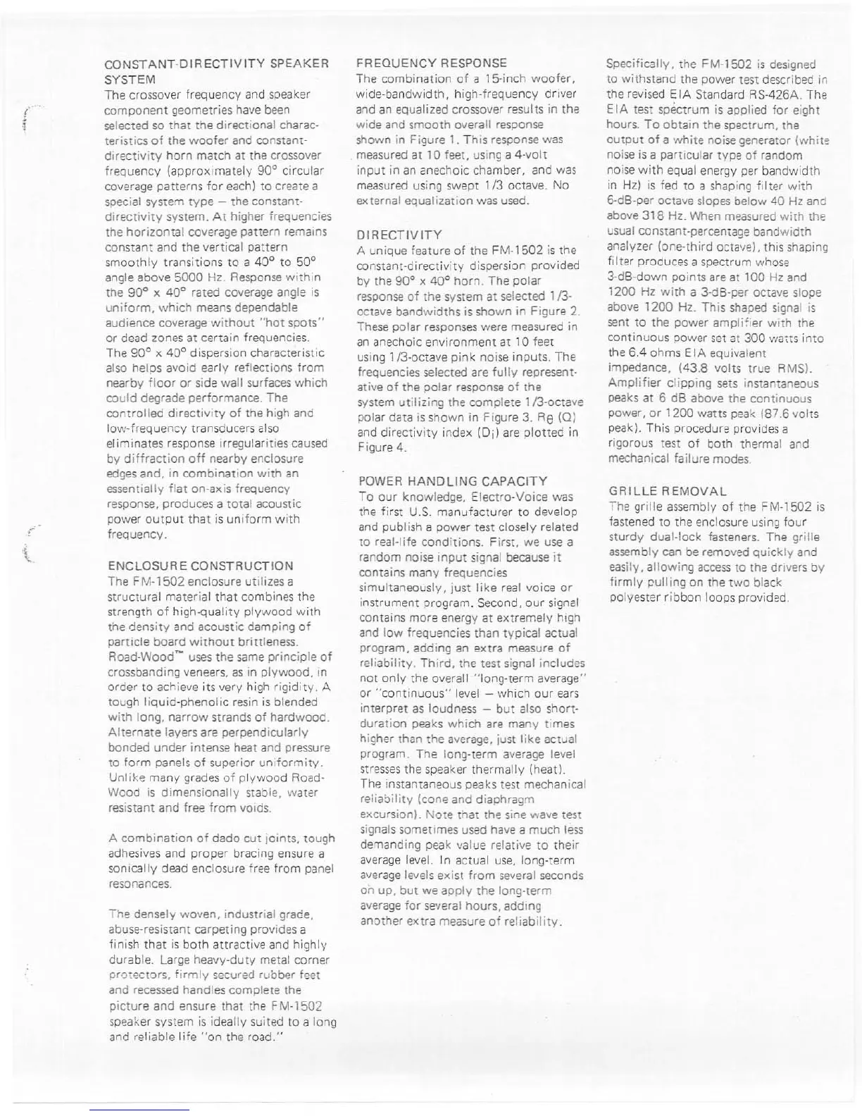 Electro-Voice FM-1502 - Enclosure Construction; Frequency Response; Directivity; Power Handling Capacity