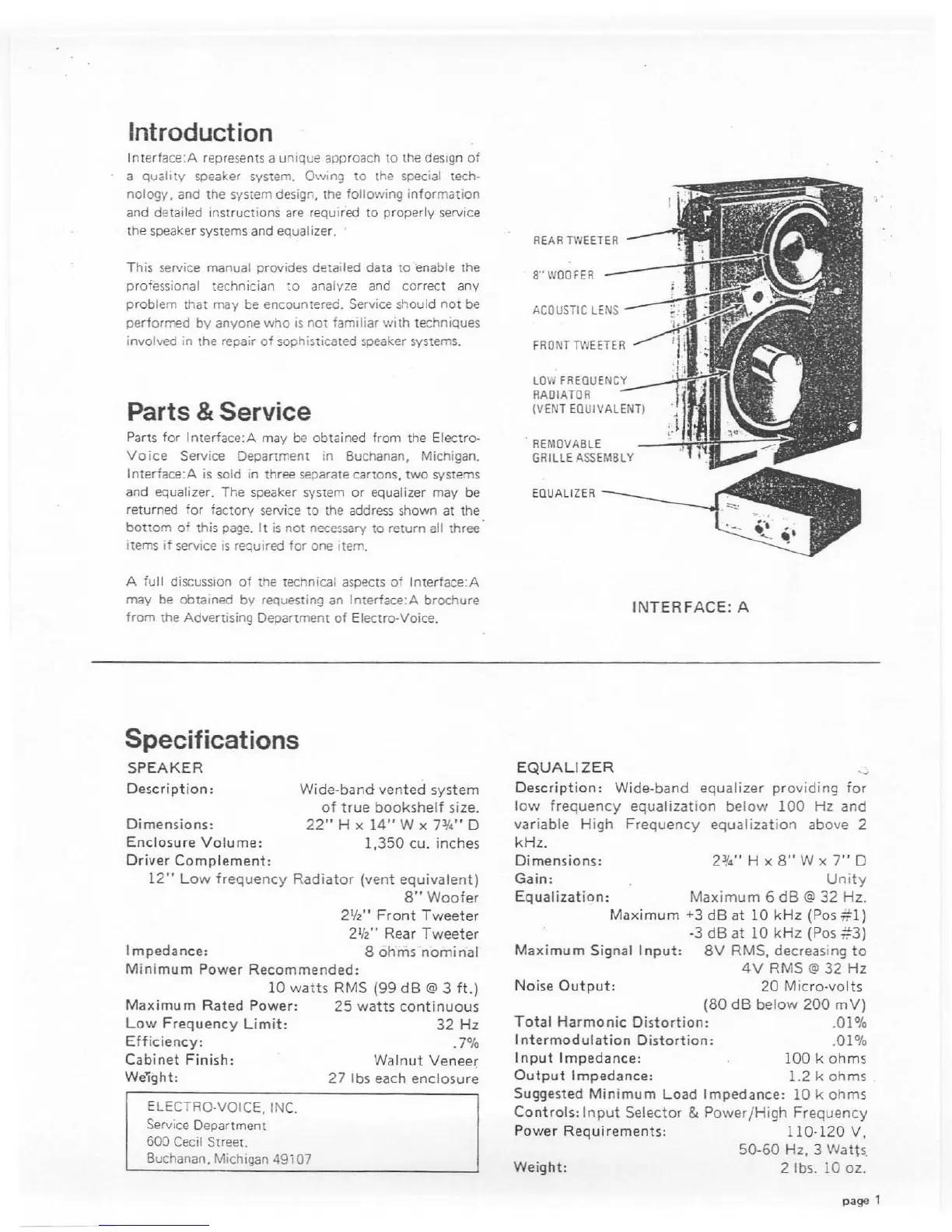 Electro-Voice Interface: A - Specifications; Speaker Specifications; Equalizer Specifications