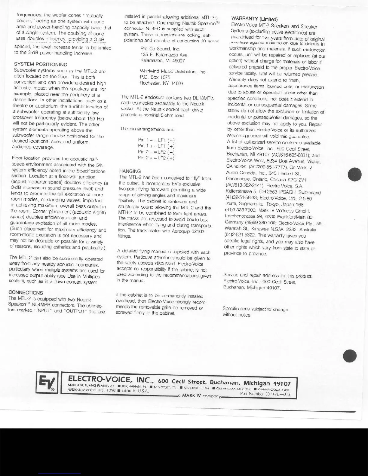 Electro-Voice MTL-2 - System Positioning; Floor Placement; Operation Away From Boundaries; Connections