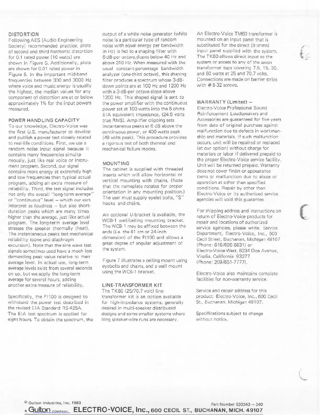 Electro-Voice PI100 - Distortion Performance; Power Handling Capacity; Mounting Options; Line-Transformer Kit