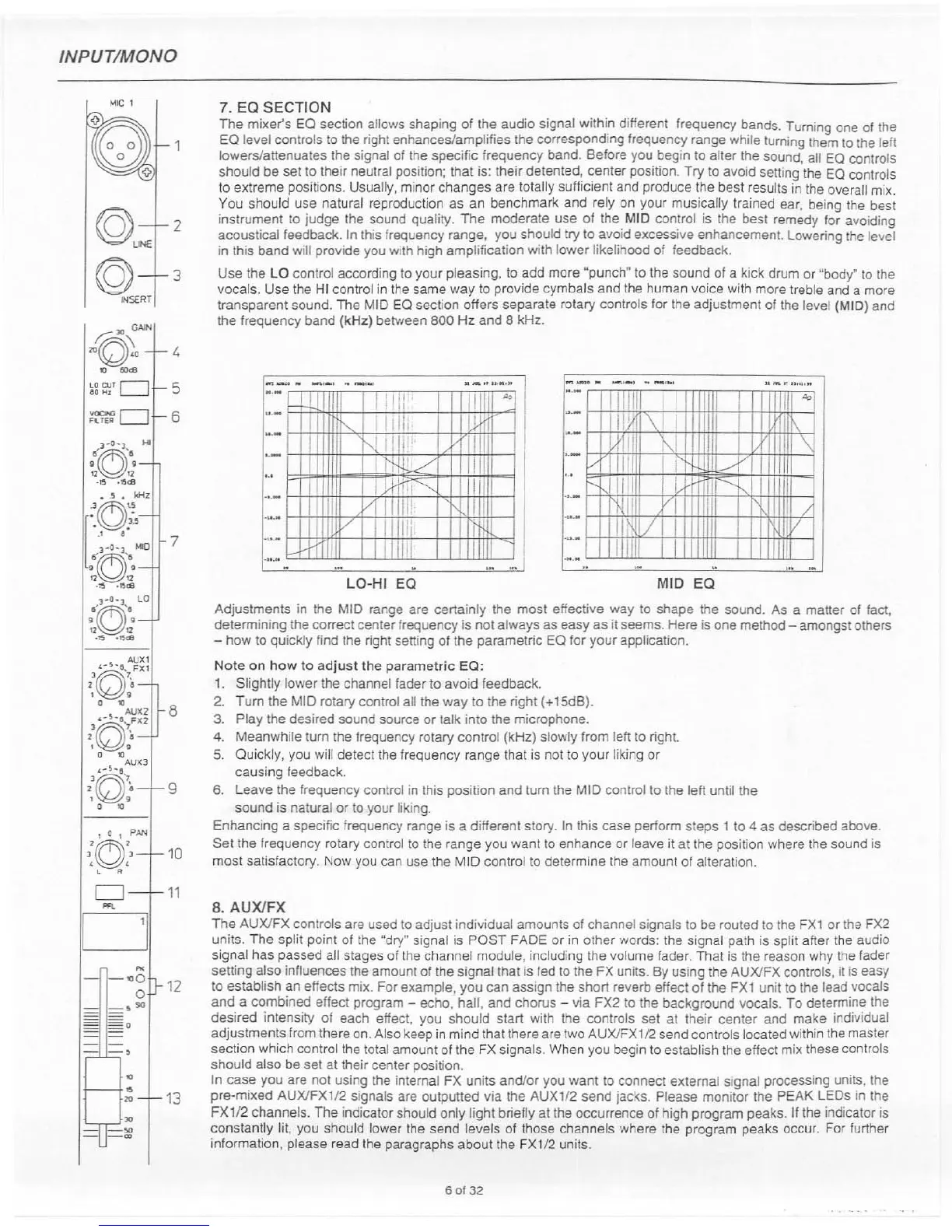 Electro-Voice PSX1000 - Mono Channel Routing and Sends; EQ Section and Parametric EQ Adjustment; AUX;FX Send Controls