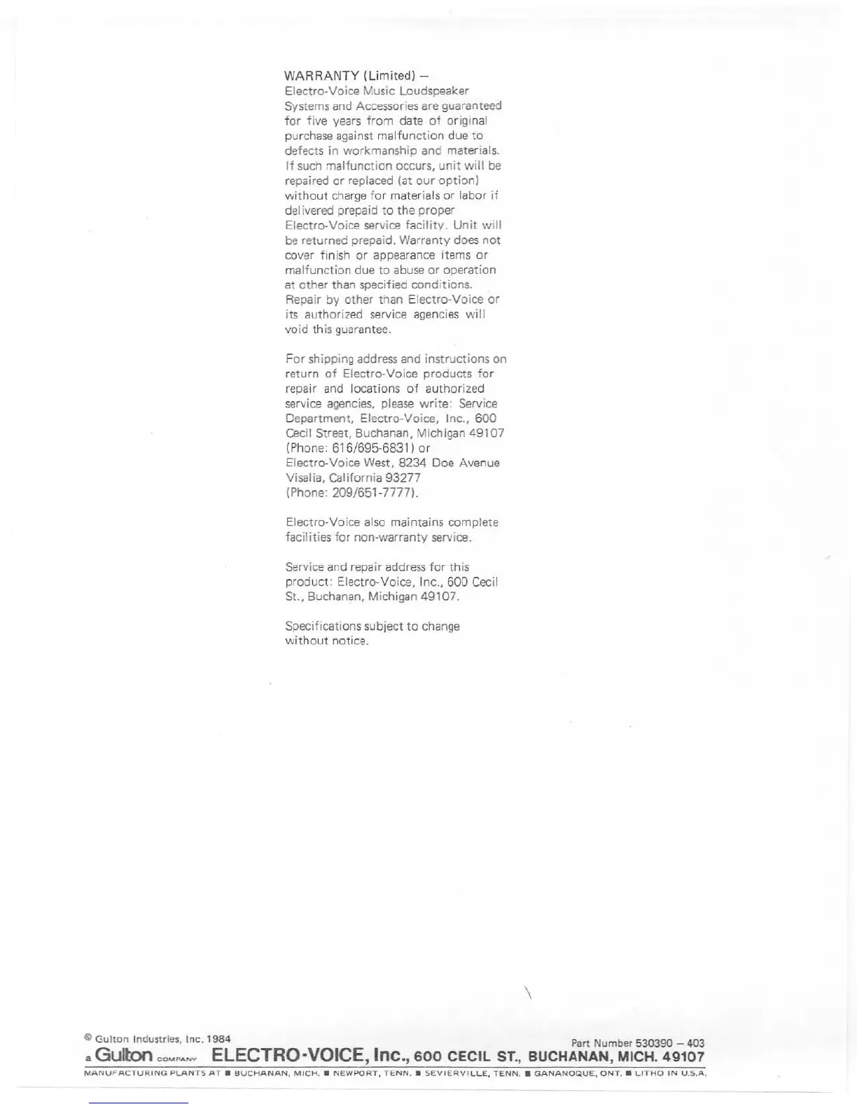 Electro-Voice S-1503 - Warranty and Service Information; Limited Warranty Terms; Service and Repair
