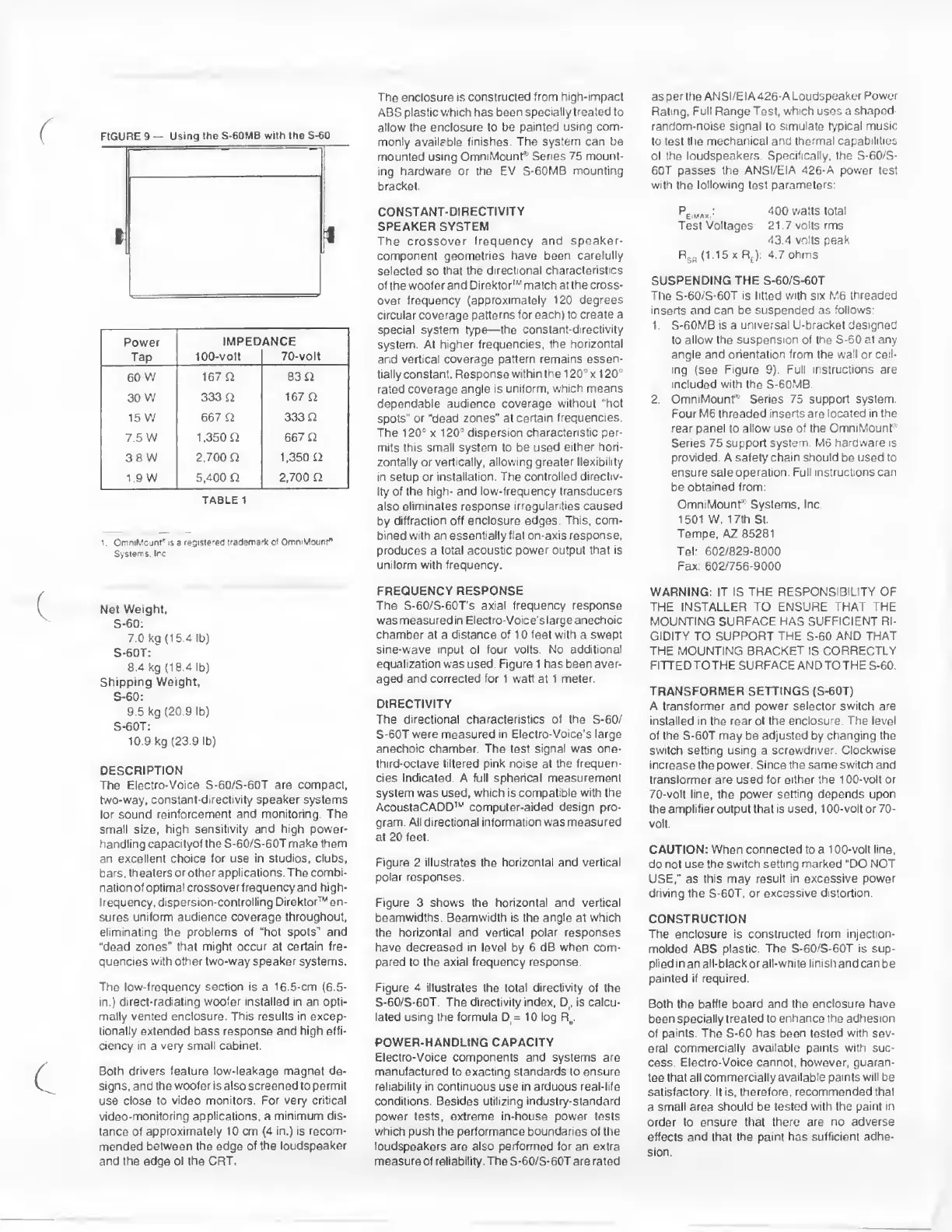 Electro-Voice S-60 - System Description and Operation; Constant-Directivity Technology; Power Handling Capacity; Suspension and Mounting