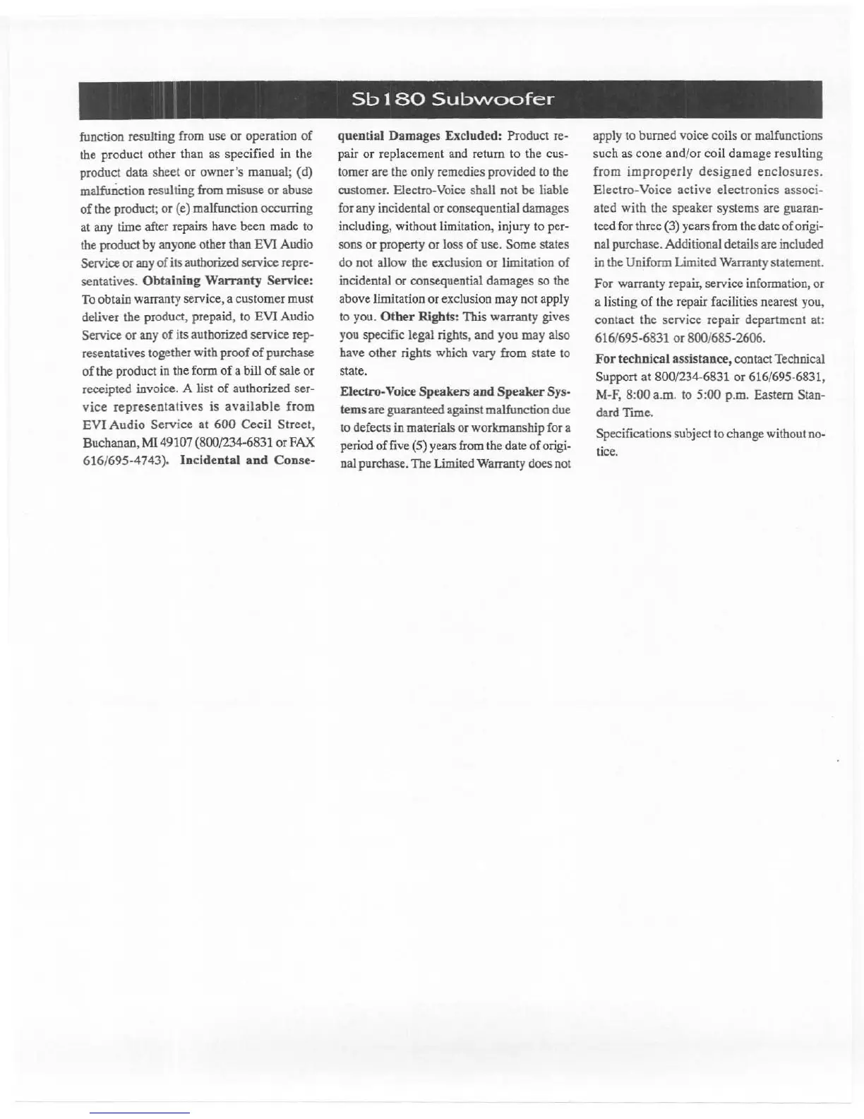Electro-Voice Sb 180 - Obtaining Warranty Service; Exclusions and Limitations