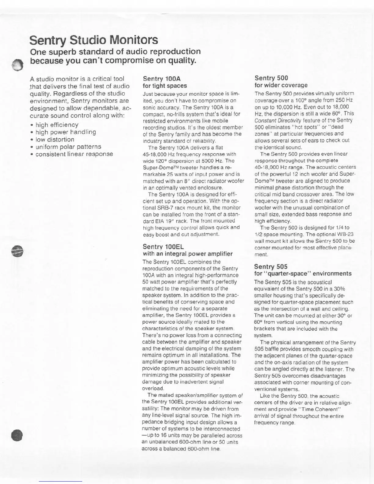 Electro-Voice Sentry 100EL - Sentry Studio Monitor Models; Sentry 100 A for Tight Spaces; Sentry 100 EL with Integrated Amplifier; Sentry 500 for Wider Coverage