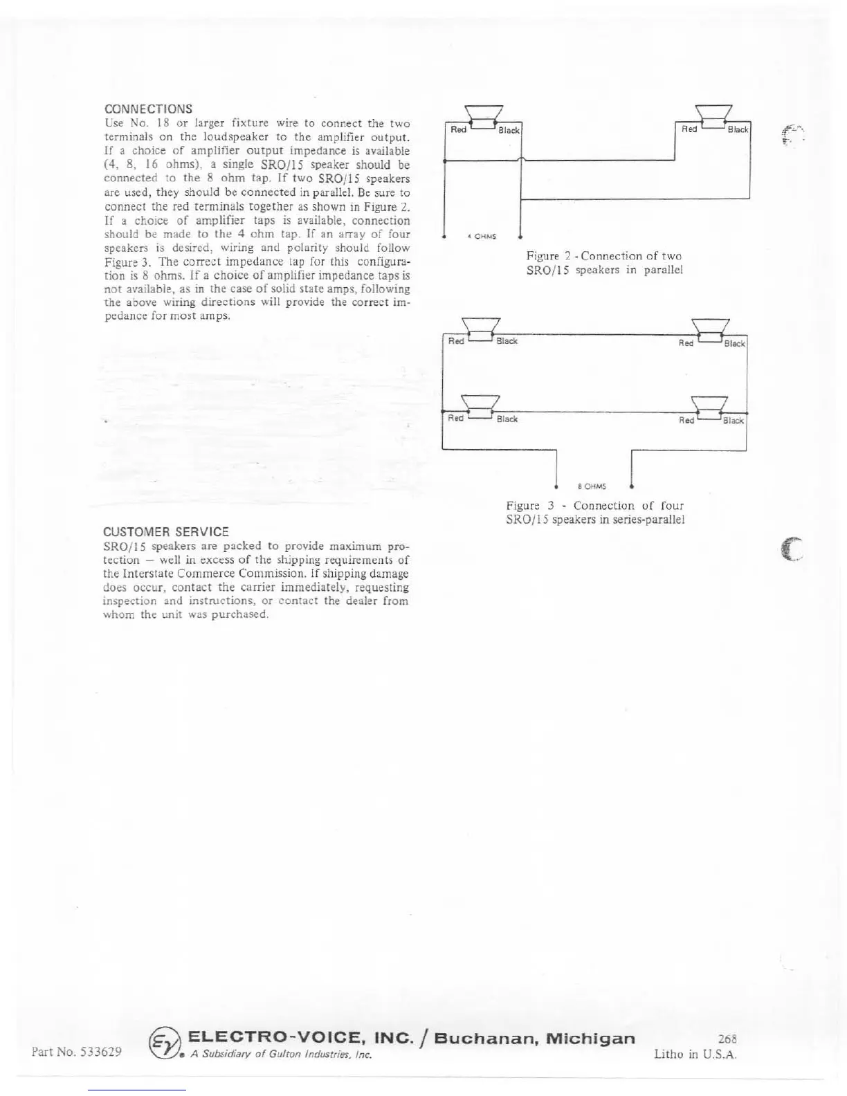 Electro-Voice SRO/15 - Speaker Connection Instructions; Customer Service and Shipping
