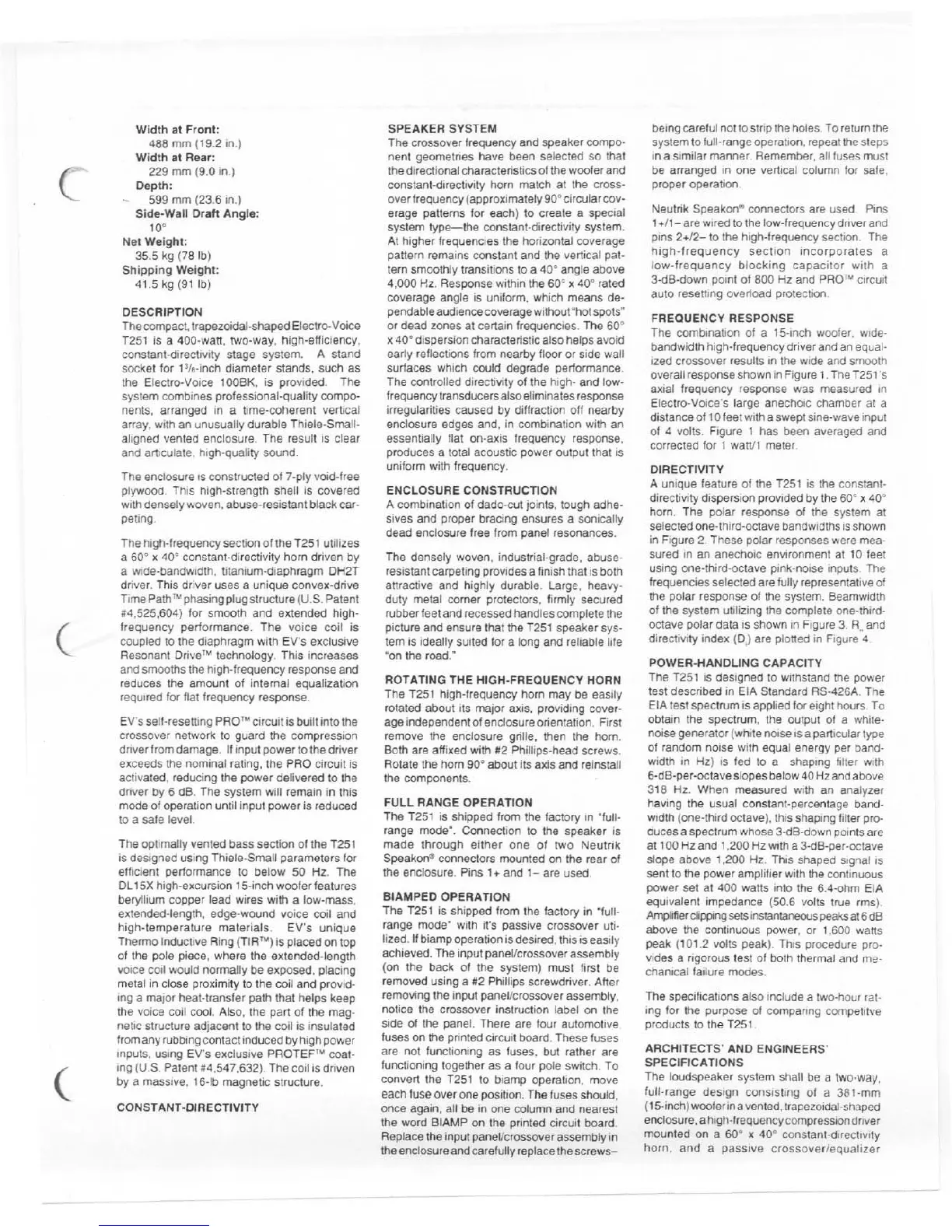 Electro-Voice T251 - Description; Constant-Directivity; Enclosure Construction; Rotating High-Frequency Horn