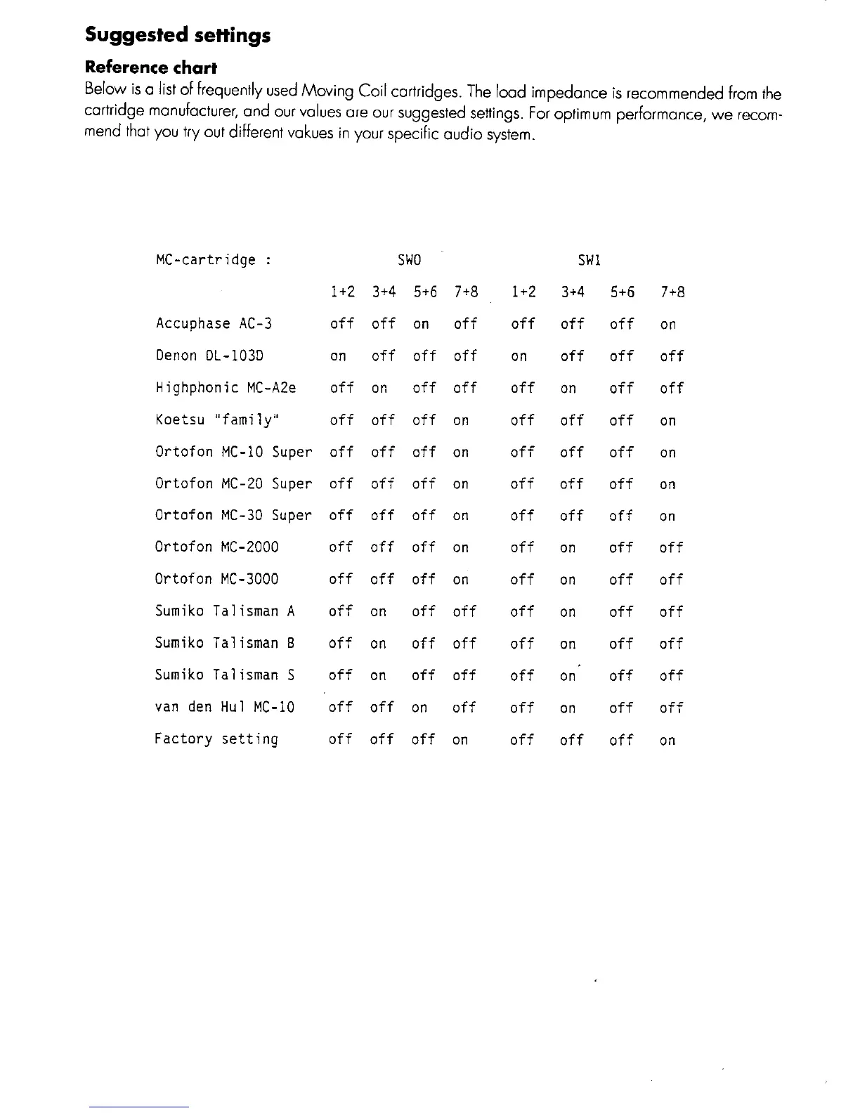ELECTROCOMPANIET EC-3 - Suggested Settings; Reference Chart