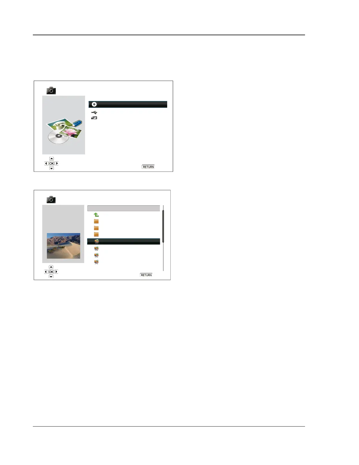 To view digital photo files stored on an optical disc, USB or e-SATA drive, select “Photo” from the Home