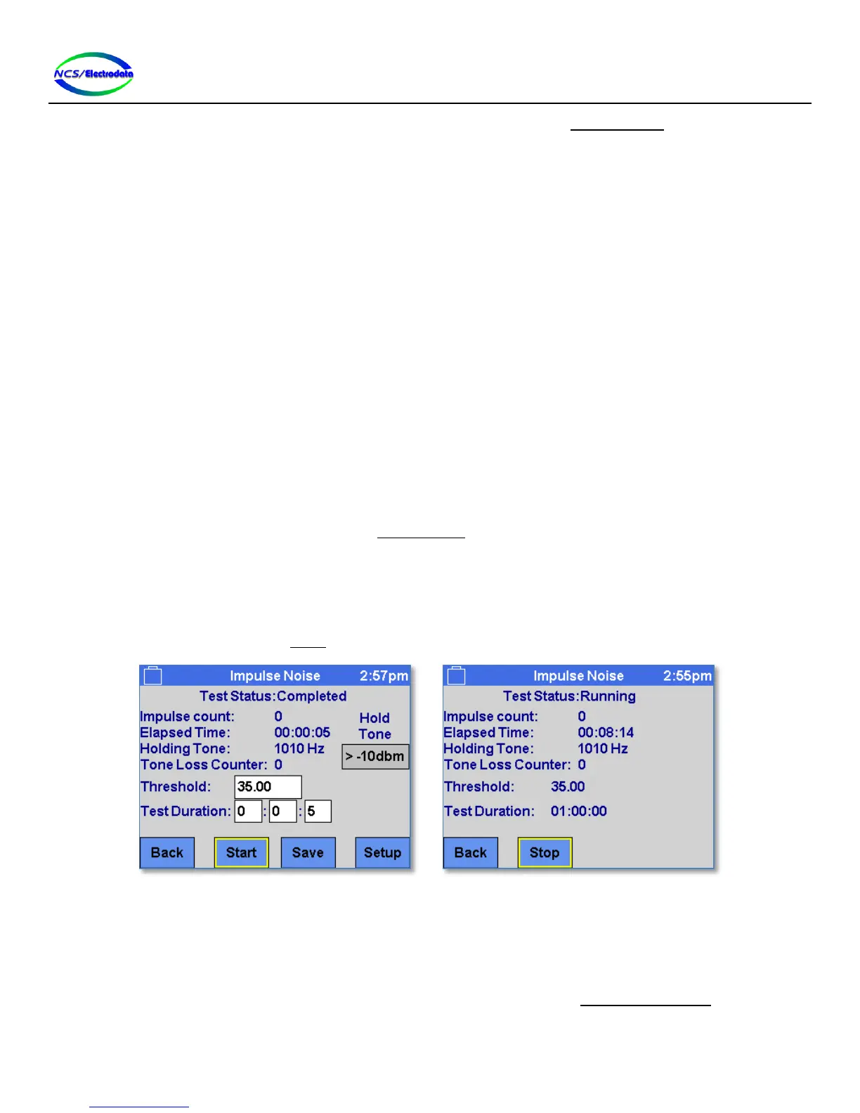 Start: Begin the impulse noise test. This test will continue for the specified test duration or until