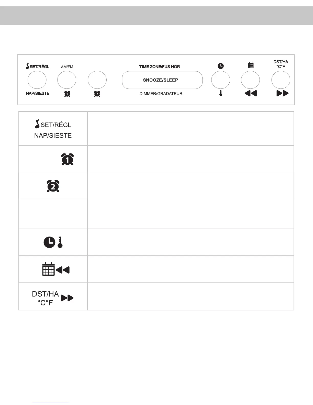 Toggle between AM & FM Radio band / Set ALARM 1