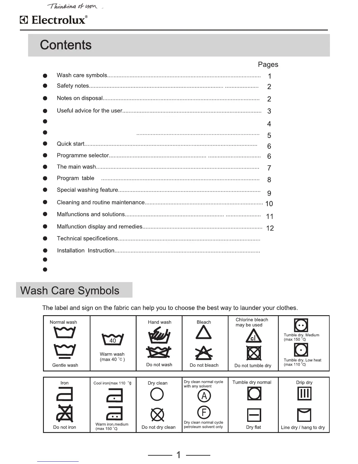 Electrolux Aura Care - Contents; Wash Care Symbols