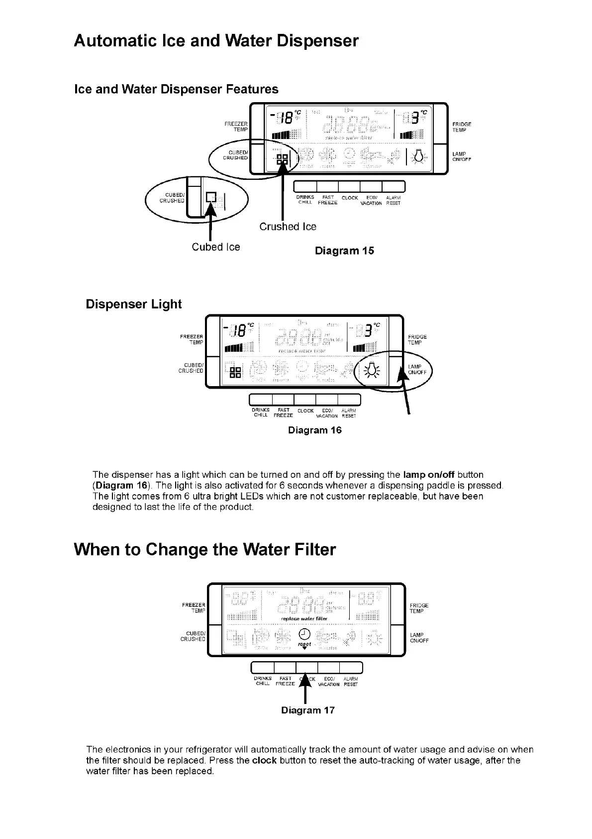 Electrolux B Series - Automatic Ice and Water Dispenser; Dispenser Light Operation; Water Filter Replacement Indicator