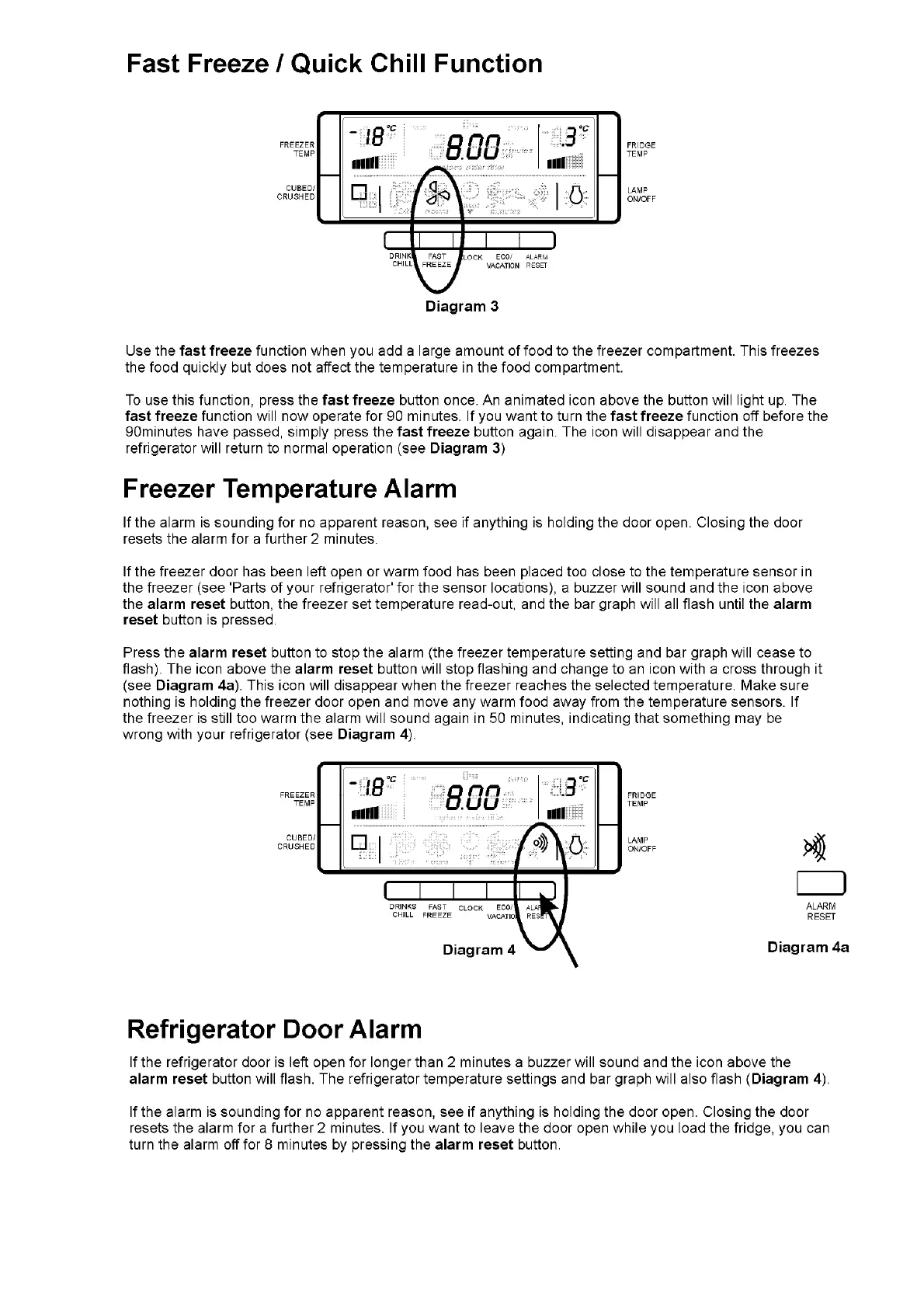 Electrolux B Series - Display Functions; Using Fast Freeze and Quick Chill; Freezer Temperature Alarm Management; Refrigerator Door Alarm Operation