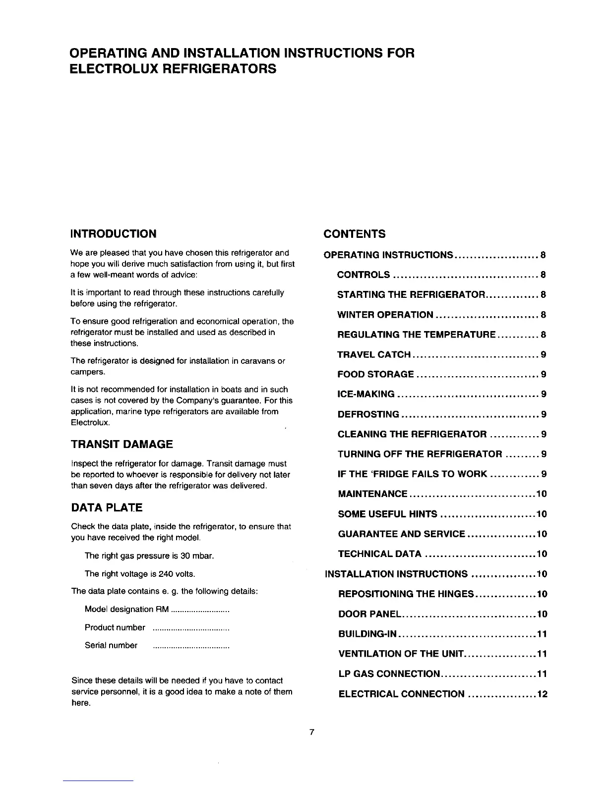 Electrolux CARAVAN RM 4360 - Introduction; Contents