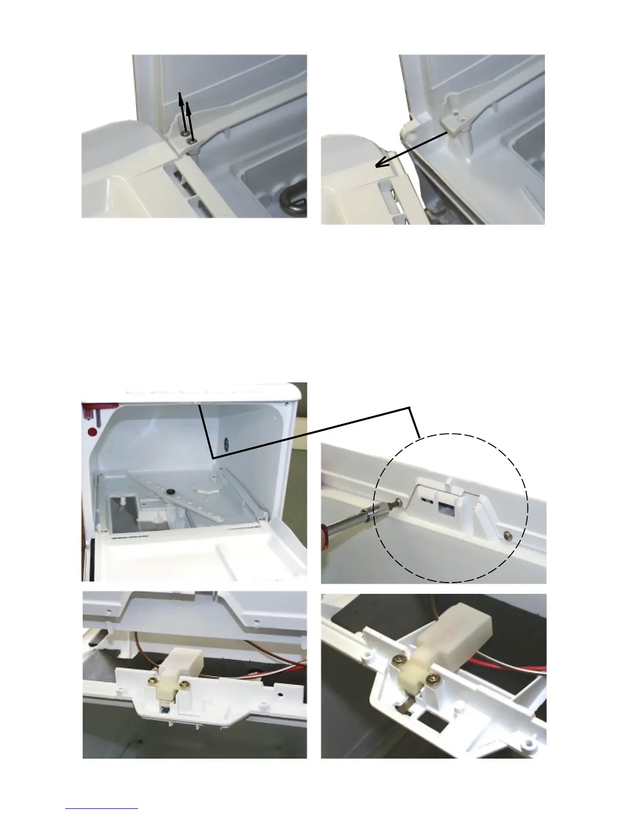 Remove the the screws on the under side of the upper panel. Lift off the upper panel. The door switch