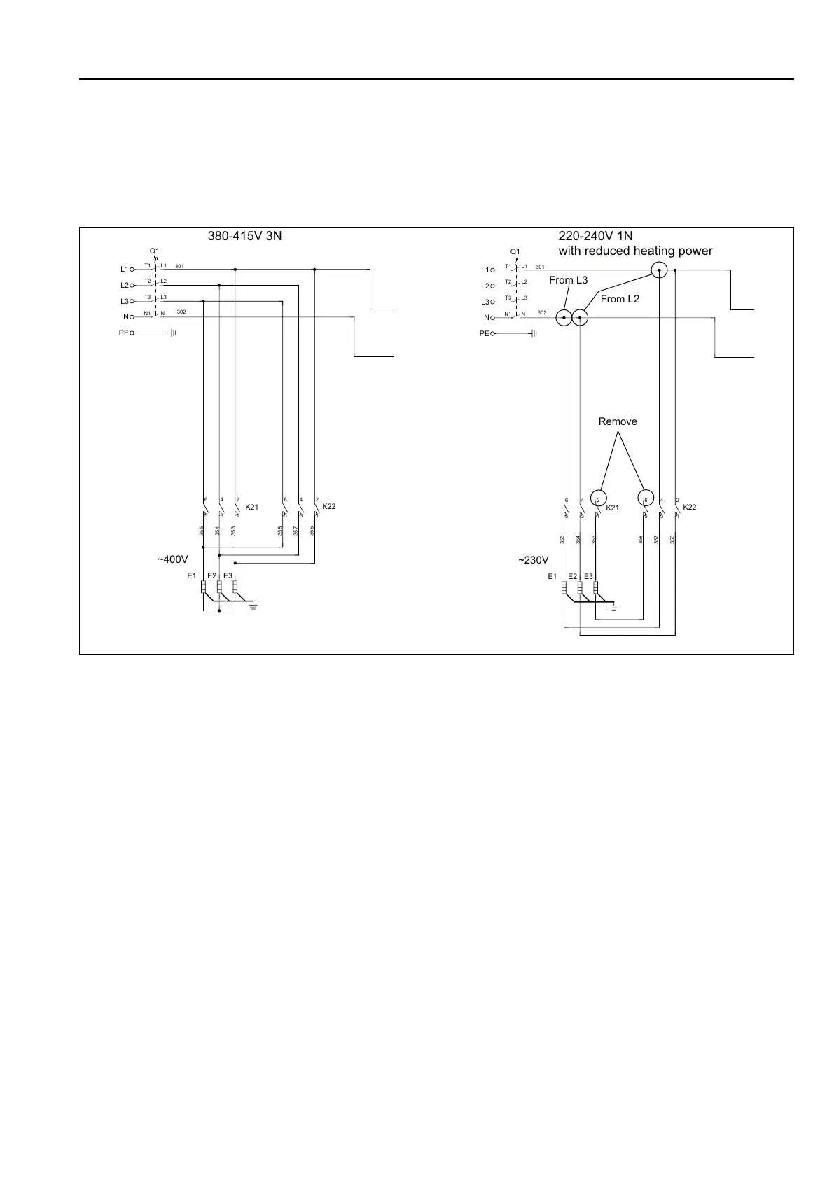Remove the cables that are connected to K21:2 and K22:6. Move the remaining cables from L2 and L3 to L1 or N ac-