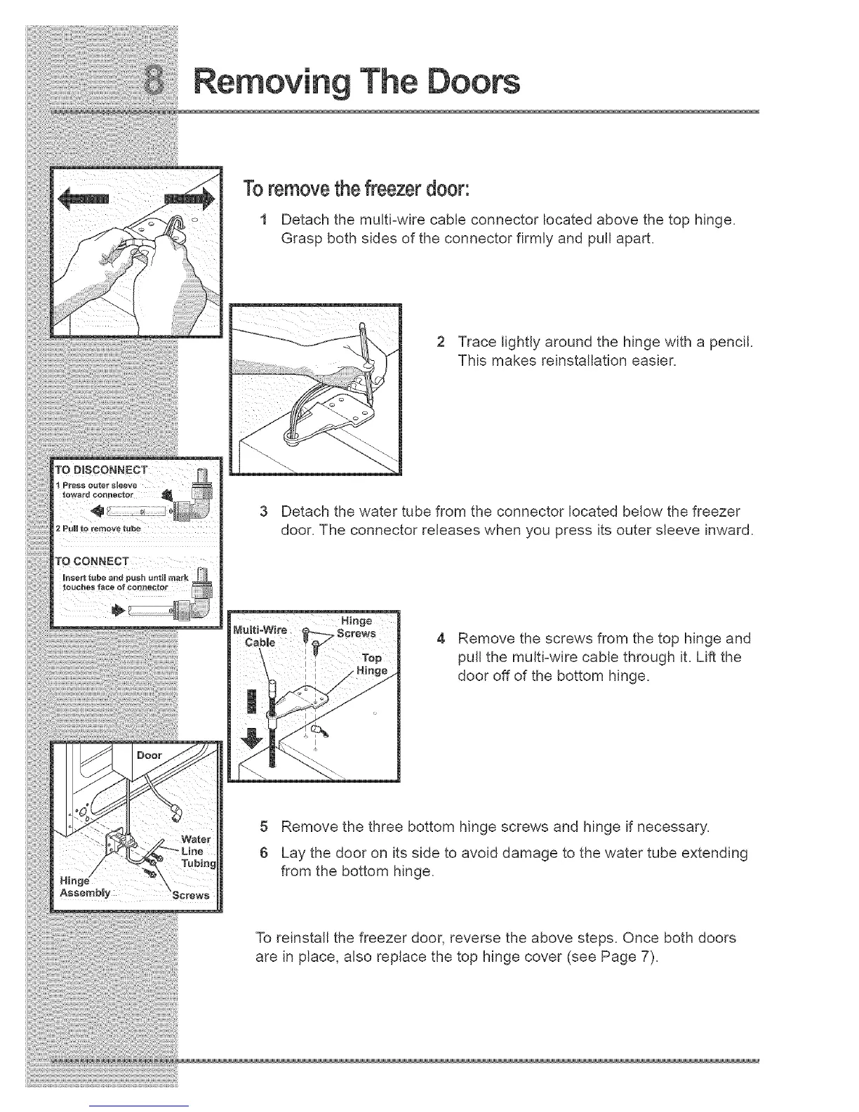 To reinstall the freezer door, reverse the above steps. Once both doors