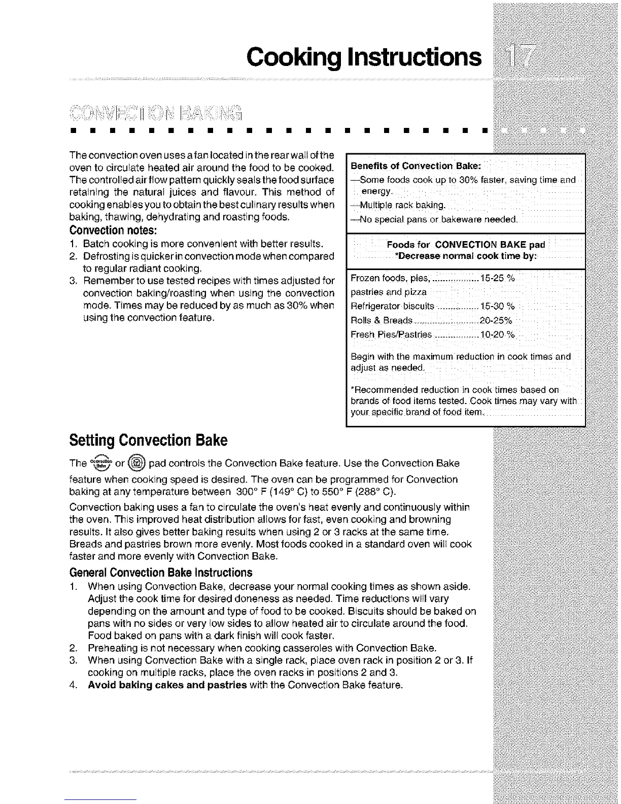 1. When using Convection Bake, decrease your normal cooking times as shown aside.