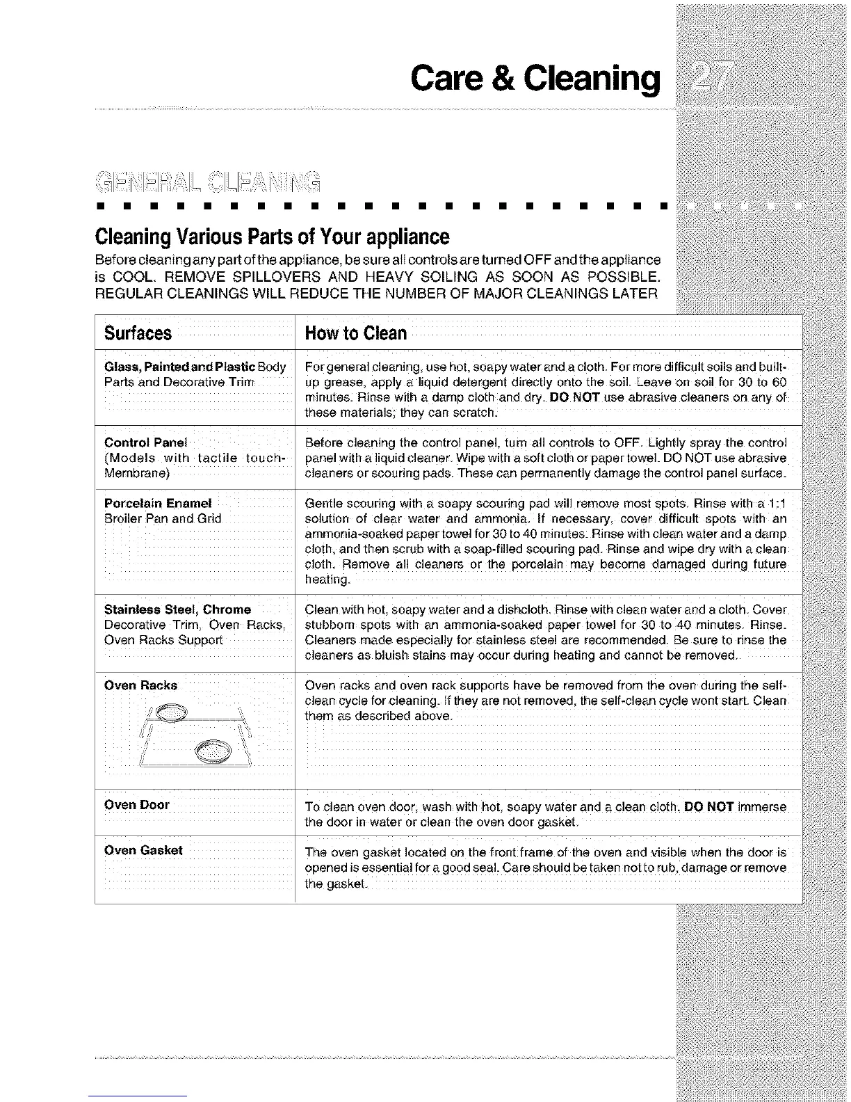 Decorative Trim, Oven Racks, stubborn spots with an ammonia-soaked paper towel for 30 to 40 minutes, Rinse.