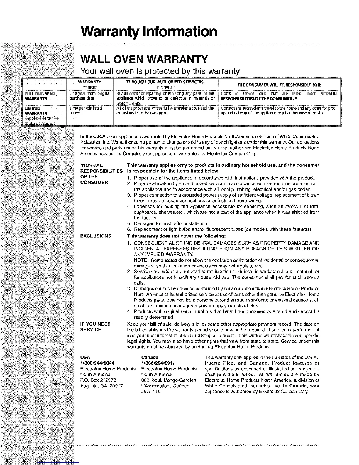 warranty must be obtained by contacting Electrolux Home Products: